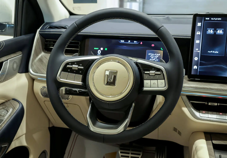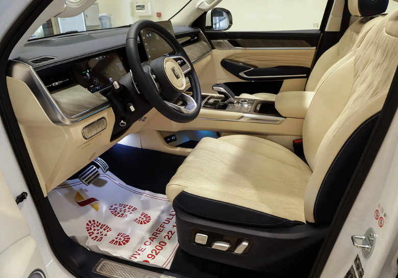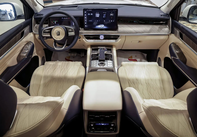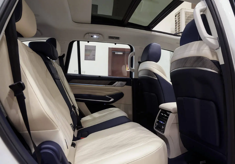 The interior of the Tank 500 is very modern, featuring a 14.6-inch central screen, a 12.3-inch digital instrument cluster, and a head-up display (HUD). Additionally, it includes an electronic gear lever, electrically adjustable front seats, Nappa leather upholstery, a three-zone climate control system, a 12-speaker Infinity sound system, and a panoramic sunroof. The vehicle offers a 7-seat configuration, providing ample space and comfort.